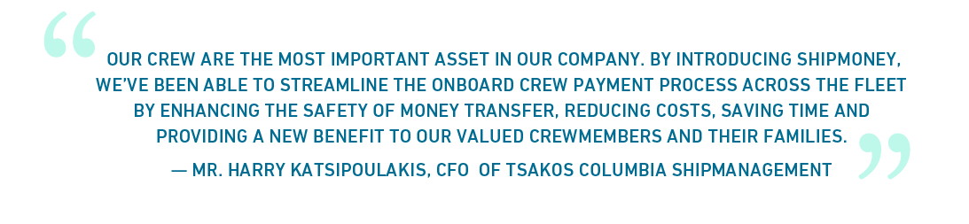 Today, Tsakos crew members worldwide use ShipMoney cards to receive their salaries, get real-time access to their wages on payday, and enjoy the flexibility to send money to whoever they want. ShipMoney significantly reduced the company’s cash-to-master expenses and eliminated cash-related security risks for the company, captains and crew members alike.